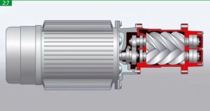 臺(tái)雙螺桿式空壓機(jī)有對(duì)稱轉(zhuǎn)子型線,壓縮室內(nèi)沒有使用的任何冷卻液。這些被稱為無油或干螺桿式空壓機(jī)?,F(xiàn)代、高速、無油螺桿式空壓機(jī)的螺桿非對(duì)稱配置,因?yàn)闇p少了內(nèi)部泄漏,所以大幅度提高了能量的使用效率。
